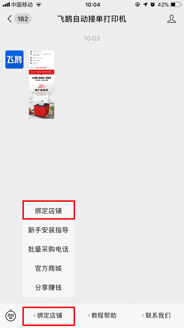 ”微信公众号,点开首页左下方的【绑定店铺】;