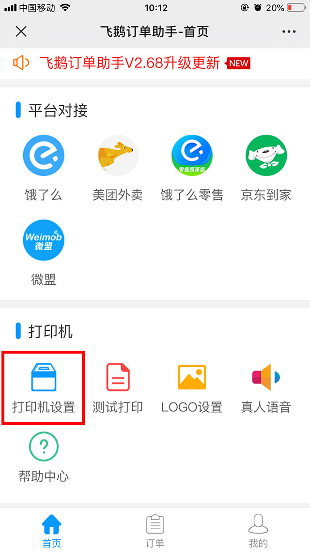 点开后,进入飞鹅订单助手-首页,在页面下方找到