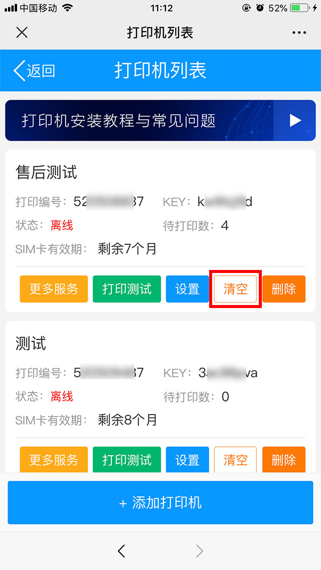 进入【打印机列表】页面,找到需要清空订单的打印机,点击